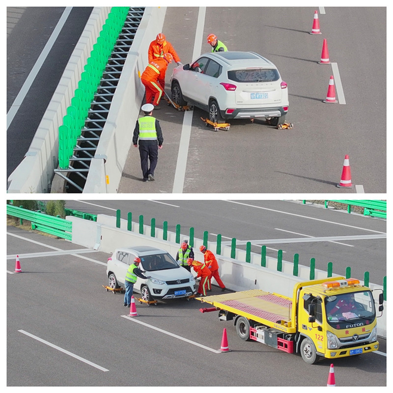 演练现场,信息中心接到巡逻交警指令,迅速通知应急、救援单位立即赶赴现场处置。施救人员到达现场后首先按规范布设作业区,利用专用移车拖车设备实施拖移作业,并迅速撤离现场。