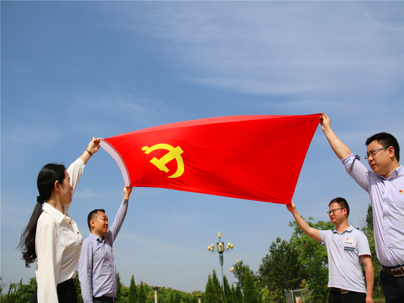 在蔚蓝天空下,pg麻将胡了 党员高举鲜红的党旗,带着满腔的崇敬之情,开展“我和党旗合个影”活动。在党员活动室里,全体党员集中学习关于中国共产党的历史论述,大家共同举起党旗,将对党的无限热爱凝聚在与党旗的合影中。