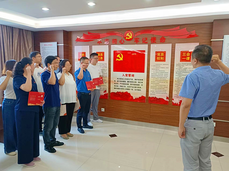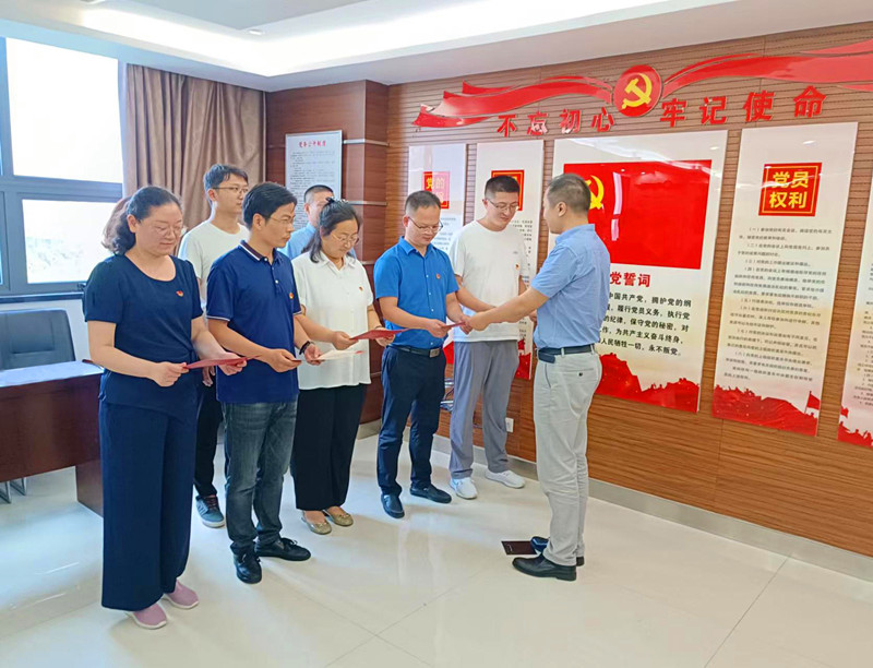 会上,党员集中学习了习近平总书记在中央全面深化改革委员会第二十六次会议上的重要讲话以及在金砖国家工商论坛开幕式上的主旨演讲,传达了省长王清宪在滁调研讲话精神,观看了《做合格的共产党员》微视频。随后,支部组织为6月份入党的党员过集体政治生日,支部负责人为7名党员赠送了政治生日纪念卡,提出了政治生日寄语和祝福,党员分享了自己的入党故事和心路历程,许下了政治生日愿望。全体党员面向鲜红的党旗,重温入党誓词,表达了矢志不渝守初心、奋发有为担使命的坚定政治信念。