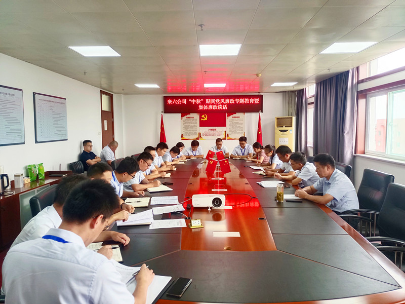 为持续深化“两违规”问题专项整治工作,确保节日期间风清气正,9月9日,来六公司开展中秋党风廉政专题教育暨集体廉政谈话,通过身边的典型违纪违法案例,为全体员工打好节前“预防针”,增强抗腐“免疫力”。