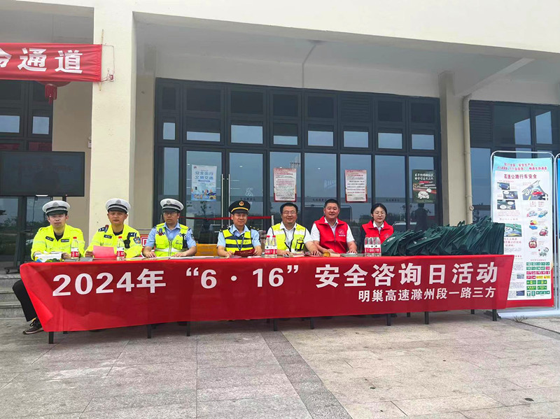 今年6月是第23个全国“安全生产月”,根据明巢公司“安全生产月”方案安排,聚焦“人人讲安全,个个会应急”目标,加强社会公众交通安全意识,普及安全法律法规和应急知识,6月17日上午,明巢公司组织党员干部联合高速交警、高速路政等单位在S09明巢高速定远服务区开展以“人人讲安全,个个会应急,畅通生命通道”为主题的“安全宣传咨询日”活动。